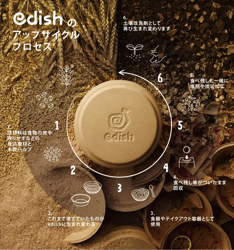 「edish」は食物製造工程の過程で発生する、コーヒーかす、お茶殻など、これまで再利用が難しかったバイオマス資源廃棄物とパルプを原料にした食器です。食器として利用後は回収し、堆肥化、炭化、紙化等の方法で再び資源にすることが可能です。