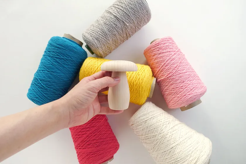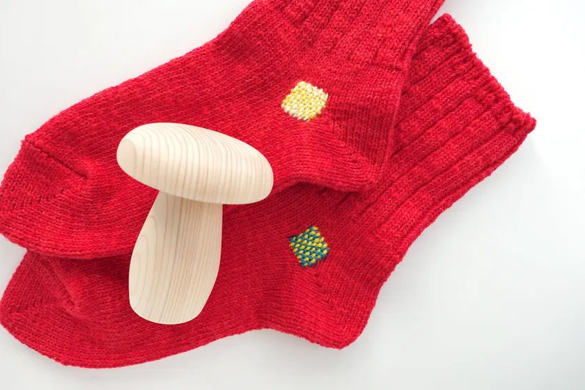 ダーニングを施す際に靴下をかぶせて固定する道具です。キノコのような形をしているので「ダーニングマッシュルーム」と呼ばれています。本ワークショップで使用するダーニングマッシュルームは、奈良県産のヒノキから一刀彫で作られたこだわりの逸品。SOUKIと同じく1927年に創業された、吉野で林業を営んでおられる森庄銘木産業株式会社様に作っていただきました。ぜひ、木の香りからも奈良を感じてください。