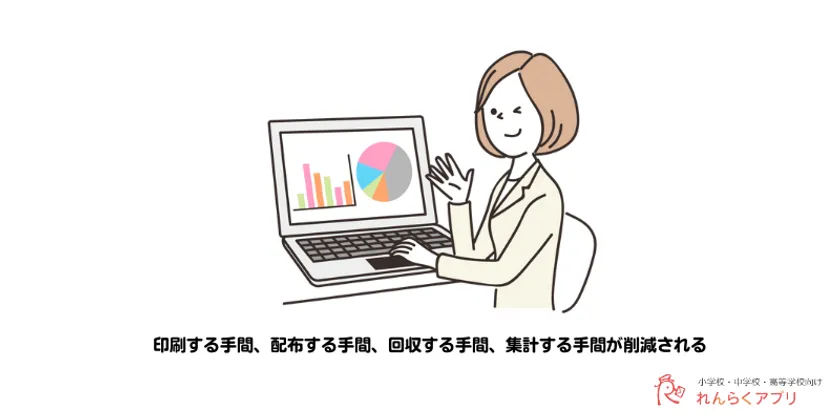 配布物は、それを作る手間だけでなく、印刷する手間、配布する手間、回収する手間、それを集計する手間などがかかります。「れんらくアプリ」のメール配信やアンケート機能を使うことで、そうした手間が削減されます。