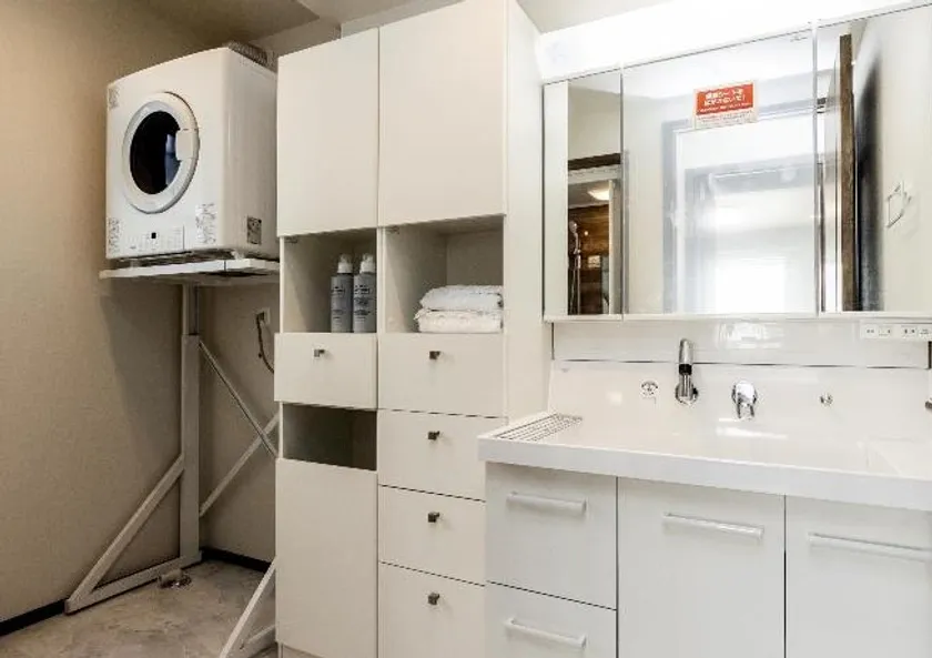 混雑しがちな朝も家族みんなで身支度できるゆとりのサニタリールーム。ガス衣類乾燥機を備え、洗う、干す、仕舞うを1箇所で実現します。