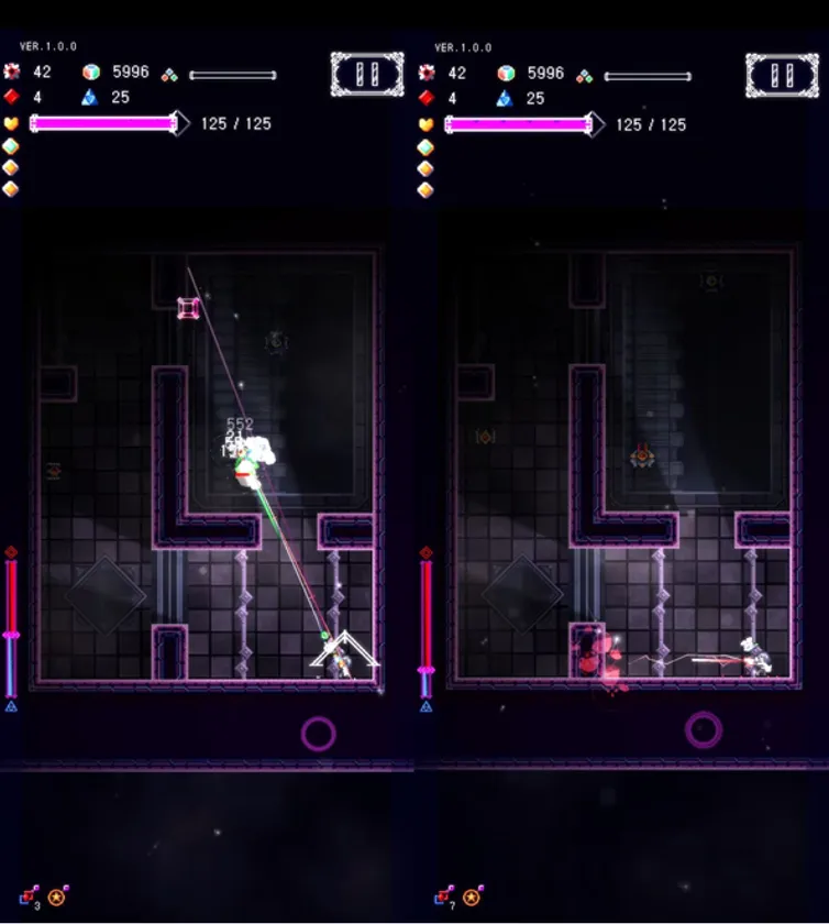 タップで発射する赤い「αエナジー」の武器と、ドラッグで照準発射する青い「βエナジー」の武器。プレイヤーはこれら2種類の武器を使用し、敵の攻撃をフリックで避けながら戦います。