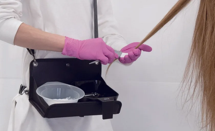訪問美容だけでなく、サロンワークにも使えるマルチなトレイ。カラーカップだけでなく、パーマ用ロッドやペーパーの一時置きにも使える便利なトレイです。折り畳み式で場所を取らず、肩掛けベルトと腰ベルトの2か所で固定するので、安定感も抜群です。