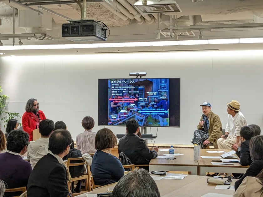 その発表を踏まえて、第二部では、ゲストにVILLAGE INC. 橋村 和徳(はしむら かずのり)氏、株式会社エンジョイワークス 福田 和則(ふくだ かずのり)氏を迎え、多拠点生活研究所の創案者である企画プロデューサー古田 秘馬(ふるた ひま)を交えた三者鼎談をしました。多拠点生活を持続させるには、そのエリアの外と内にキーパーソンがいること、またスナックがある地域は交流がうまくいっているなど、色々な体験談が飛び交いました。また多拠点生活の大きな壁「費用問題」の解決案として、多拠点生活をするときにお金の心配がいらない、むしろお金が少し増える理想的な仕組みづくりを提案しました。それは住まいそのものを所有でも賃貸でもなく、稼ぎながら暮らす第三の場として活用すること。デベロッパーが開発する段階から自分たちも参加し、特定多数の仲間で少しずつ投資、建った家を自分たちで購入し、使わない時は誰かに貸すなど、お金の使い方の可能性を広げ、その場づくりの関わり方を変えるアイディアです。プチ・デベロッパー気分を味わえて、少しのリスクでできる“良いとこ取り”の仕組みづくりは、多拠点生活の可能性を広げてくれるかもしれません。