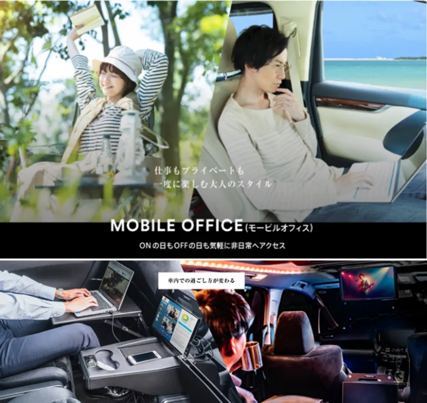モービルオフィス仕様にコーディネートされた「トヨタ アルファード」は、仕事もプライベートも一度に楽しむ大人STYLEを提案する、プライベート空間を兼ね備えた移動オフィス車両です。ポケットWi-Fiやサブディスプレイ、Google TVや多機能セカンドシートコンソール&デスクなどを装備しました。ONもOFFも気軽日常へアクセスし、ミニバン車両の新しいリアシートでの過ごし方を提案していきます。
