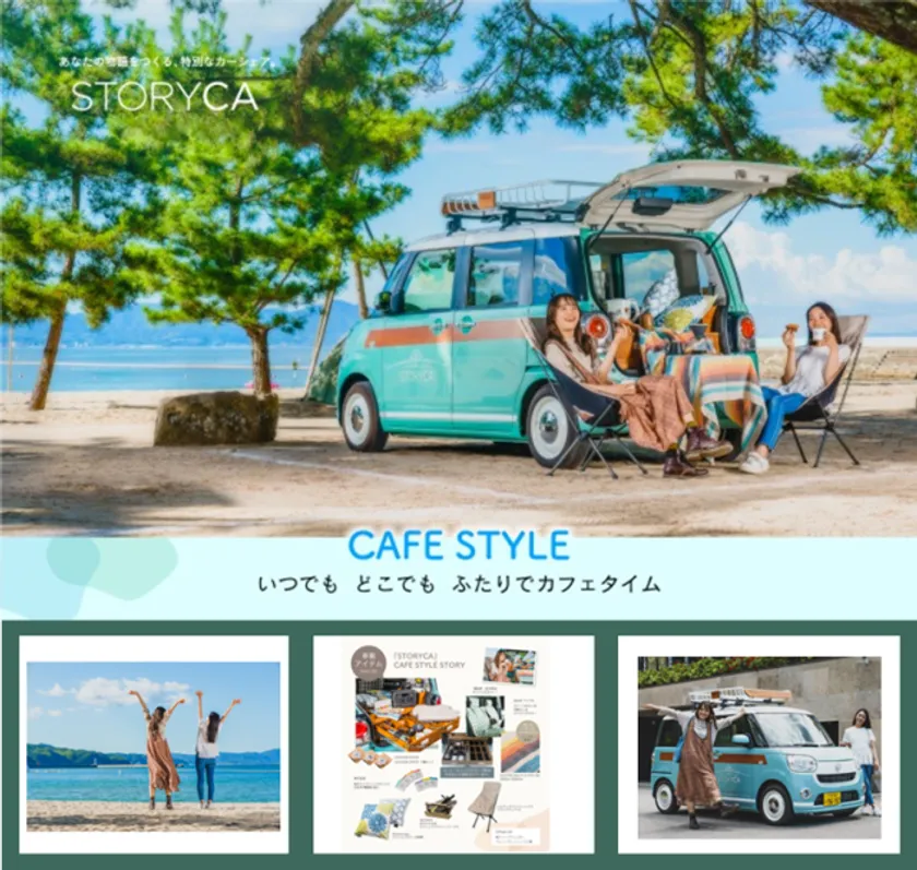 お気に入りの場所にクルマを停めて、車載のかわいいイス・テーブルを広げ、二人だけの非日常空間を楽しめる「STORYCA」アクティビティの「カフェスタイル」。「ダイハツ キャンバス」を座席カバーやホイールに至るまでオシャレにアレンジし、ケトルやコーヒーミルなどのカフェアイテムはもちろん、北欧柄のクッションやマルチクロス、ピクニックバスケットテーブルなど、最高の1日を演出する装備を搭載しています。