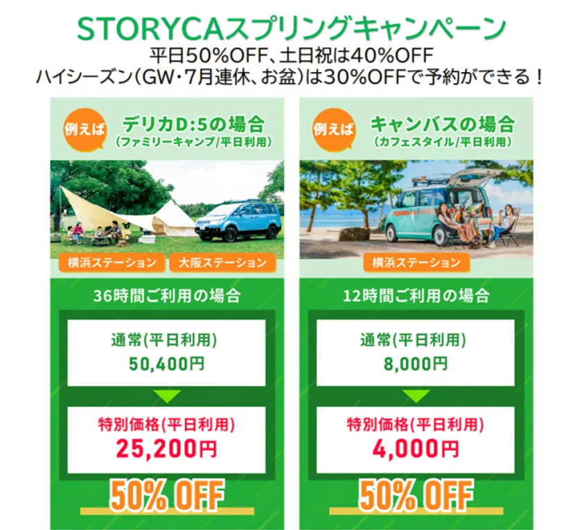アルパインマーケティング株式会社(本社:東京都大田区、代表取締役:石田 宗樹、以下:当社)は、キャンプやアクティビティに必要な道具や装備と車両貸出がセットになったカーシェアリングサービス「STORYCA」(読み:ストリカ)の利用料が最大で50%OFFの特別価格で予約できる「STORYCAスプリングキャンペーン」を5月31日(水)まで開催中です。