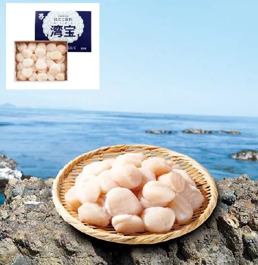 プランクトンなどの養分が豊富な渡島半島の東側の噴火湾長万部沖で、「耳吊り」という養殖方法によって育てられたホタテは、過酷な環境で育てることにより、身が厚く甘みの強いホタテに育ちます。『湾宝』は町の自慢の宝物。長万部漁協では、採れたて新鮮な状態で急速冷凍し、鮮度の良い商品に仕上げています。刺身はもちろん、バター焼きやフライにもぴったりです。