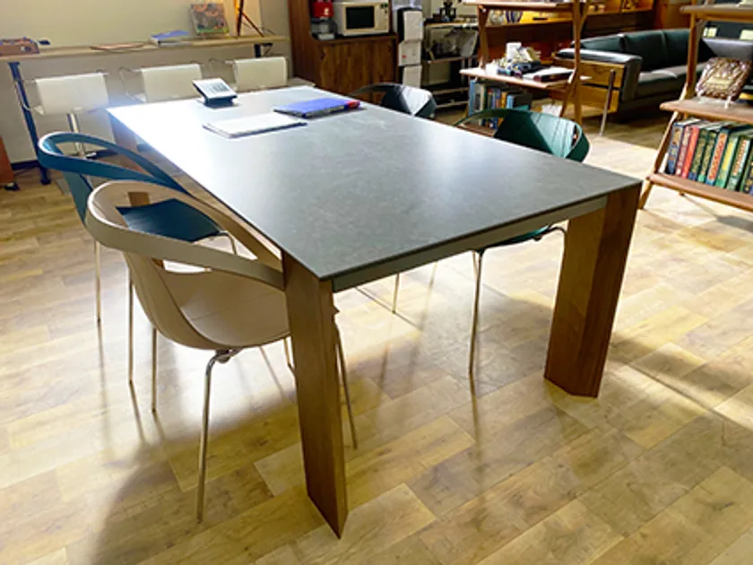 熱や傷に耐性が高いセラミックを使った天板と、無垢のウォールナットの脚部とのコンビネーションが美しいダイニングテーブル。