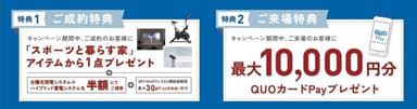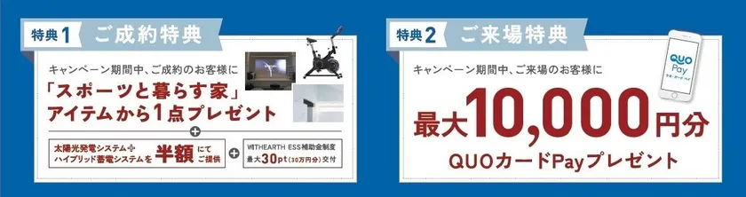 今回のキャンペーンでは、期間中にご成約いただくと、「スポーツと暮らす家」アイテムの中から、もれなく1点をプレゼントいたします。加えて、太陽光発電システムとハイブリッド蓄電システムを半額にてご提供。さらに、太陽光発電システムとハイブリッド蓄電システムをセットで導入したお客様にはウィザースホーム独自の補助金制度「WITHEARTH ESS補助金」が適用され、最大30ポイント(30万円分)を補助金として交付いたします。また、キャンペーン期間中にご来場いただくと、住まいづくりのステージに合わせて最大1万円分のQUOカードPayを進呈。こだわりのマイホームを建てたい人たちを応援するご来場特典もご用意しています。