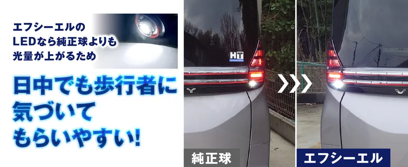 純正LEDバックランプのルーメン数は約700lmですが、fcl.のパワーアップLEDは約4倍の3,000lmです。夜間の駐車だけでなく、日中でも被視認性がアップし、安全性が向上します。