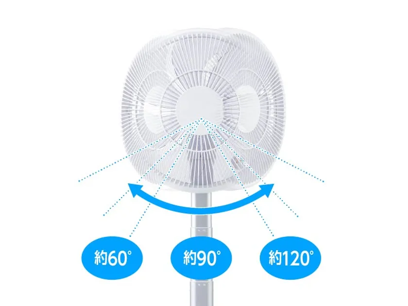 左右首振りはリモコンで操作可能で約60度・90度・120度の3段階に設定ができます。風を集中して当てたい、ワイドに送風したいなど、用途に合わせてお使いいただけます。