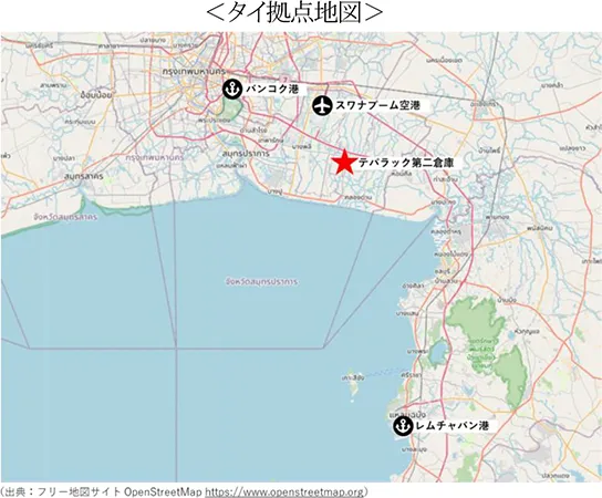 同地区はバンコク港、レムチャバン港、スワナプーム空港等の重要物流施設の中間地点にあり、お客様の幅広いニーズにお応えできるロケーションです。このたび、テパラック倉庫(2023年1月開設、約20,000平方メートル)に次ぐ拠点として「テパラック第二倉庫」を開設し、タイの製造業回復に伴う旺盛な倉庫需要にお応えするとともに、ロジスティクス事業の更なる拡大を目指します。