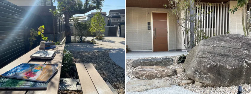 入居者の皆様が青空の下テレワークができるテーブルと椅子(左) 既存の石を使った玄関アプローチ(右)