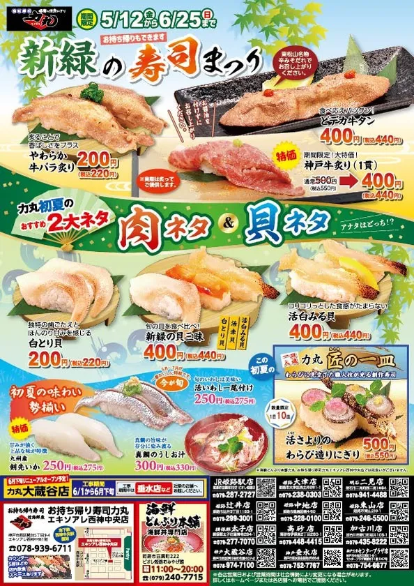 兵庫県姫路市を中心に回転寿司力丸を12店舗、海鮮どんぶり店1店舗、お持ち帰り専門店1店舗を展開する株式会社関西フーズ(代表取締役:福永 力夫)は、回転寿司力丸にて2023年5月12日(金)~6月25日(日)の期間限定で新緑の寿司まつりを開催します。地域の皆様、お子様に旬魚や地元の魚を知っていただくために実施している期間限定のフェアでございます。