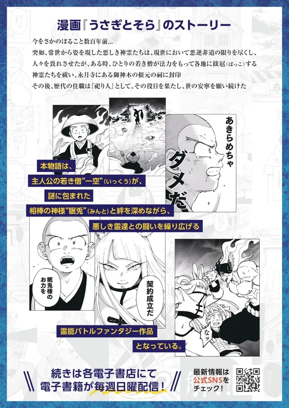 漫画『うさぎとそら』は2023年3月19日(日)より連載が開始した霊能バトルファンタジー漫画で、最新話となる第8話を2023年5月7日(日)より「コミックシーモア、Amebaマンガ、DMMブックス、FOD、Renta!、紀伊國屋書店Kinoppy ※ほか順次配信予定」などの人気電子書店にて、電子書籍の配信を開始いたします。