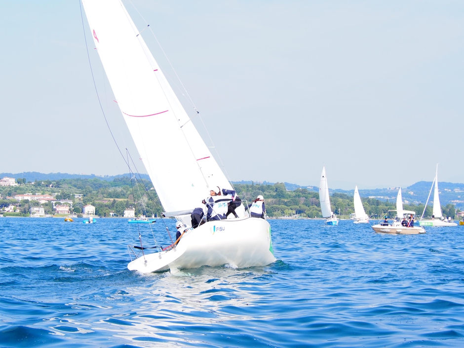 本学ヨット部が日本代表として出場している「FISUデゼンツァーノ2024世界大学セーリング選手権大会」(開催地:イタリア・ガルダ湖)は最終日の6月9日、上位グループが争う「ゴールドフリート」3レースと下位グループによる「シルバーフリート」3レースが行われました。本学ヨット部は「シルバーフリート」で3レースともスタートで優位に立つなど善戦しましたが、大きな風の振れやダウンウインドで順位を下げ、結果はそれぞれ4位、3位、3位で、最終順位は12位となりました。