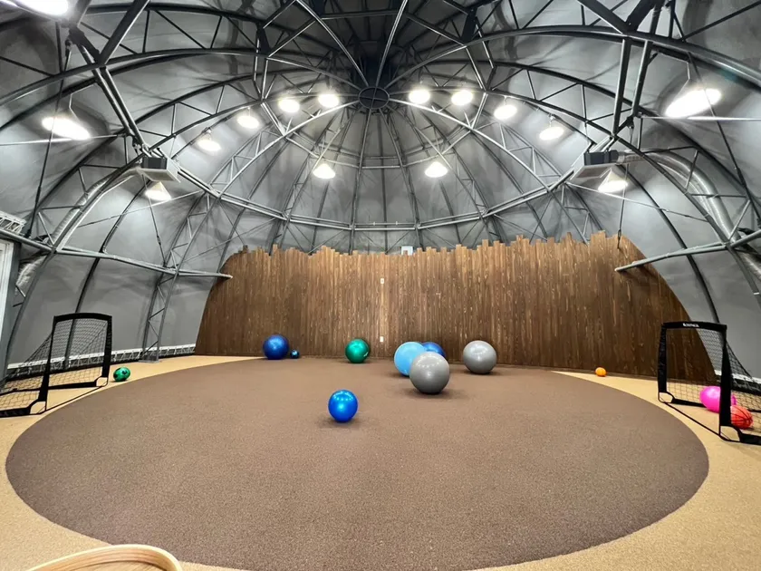 雨の日や湿気の多い時期、外の暑い日や寒い日でもおもいきり遊んで頂けるように空調設備を完備したドーム型の遊具施設を新設いたしました。室内ではボールやゴールなども用意されており、3階建ての本館とあわせ、お子さんにあった遊び方を用意しました。