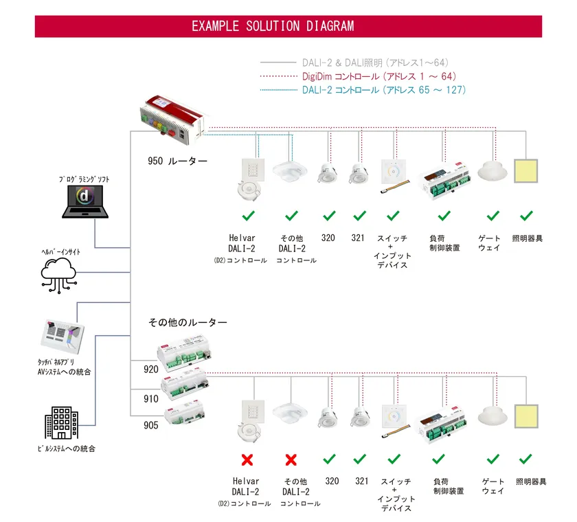 950ルーターは、従来のDALIデバイスに加えDALI-2照明、DALI-2コントロールを制御することができるDALI-2認定アプリケーションコントローラ(マルチマスター)です。