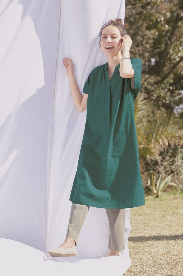 また、ハリと落ち感がある長袖タイプの「前開きシャツ」と「前開きワンピース」は、リラックス感がありながらもスッキリとしたシルエットで、1枚着としても、羽織りとしても着られる着回し力抜群の幅広いコーディネートで活躍する優秀アイテムです。