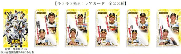 阪神甲子園球場内売店・ワゴン及び外周お弁当ワゴンで「監督・選手コラボグルメ」を1商品ご購入ごとに、阪神タイガースの監督・選手がデザインされた「限定カード(ノーマル:全22種、レア:全23種)」のうち、1枚をプレゼントいたします。なお、レアカードの「監督・選手集合 ver」はお弁当商品を購入された方のみ対象となります。