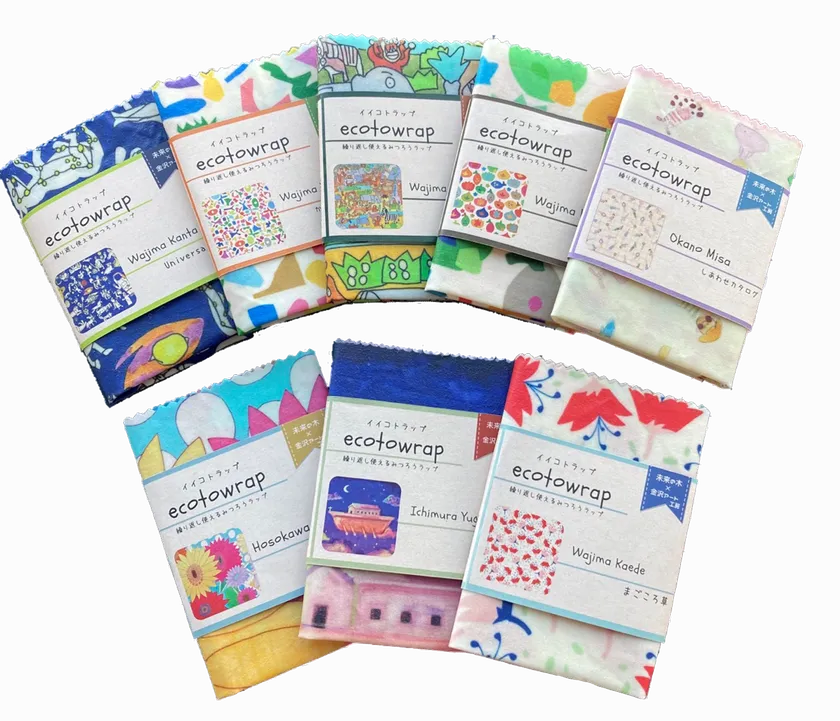 イイコトラップの最大の特徴はデザインです。金沢アート工房様とコラボレーションして、障がいのある方のアート作品を使用しました。全8種のうち5種は有名アパレルブランドや全国区イベントでデザインが採用され、活躍されている輪島貫太さん、楓さんご兄妹の作品を使用し、他にも市村悠賀さん、岡野未沙さん、細川陽平さん、計5名の作家さんの作品を使用しております。