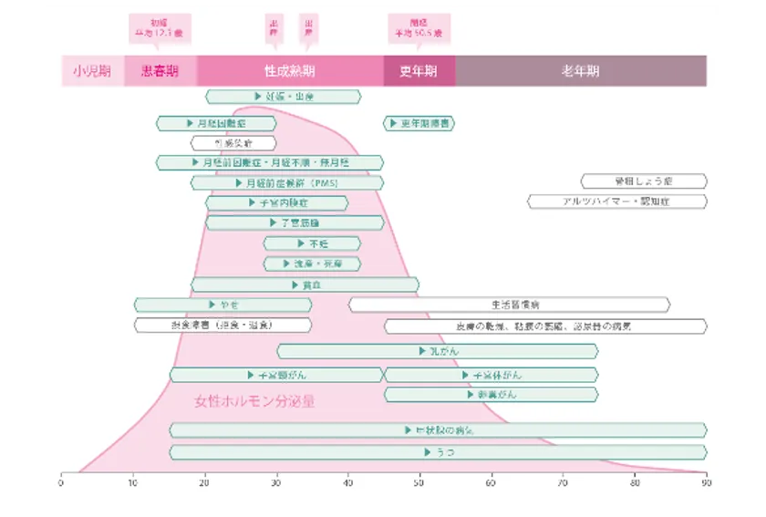 しかし、働き盛りの年代である20代後半から40代の期間は、厚生労働省の「働く女性の心とからだの応援サイト」に掲載されている、「女性特有の健康課題」によると、女性ホルモン分泌量の増加と減少に伴う性成熟期と更年期にちょうどぴったりと重なり、女性特有のかかりやすい疾患や症状も多くみられる年代でもあります。