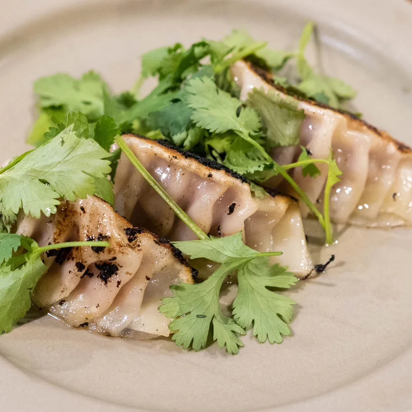 ラムひき肉とパクチーをふんだんに使用した手作りラム餃子。ハイボールやレモンサワーとも相性抜群