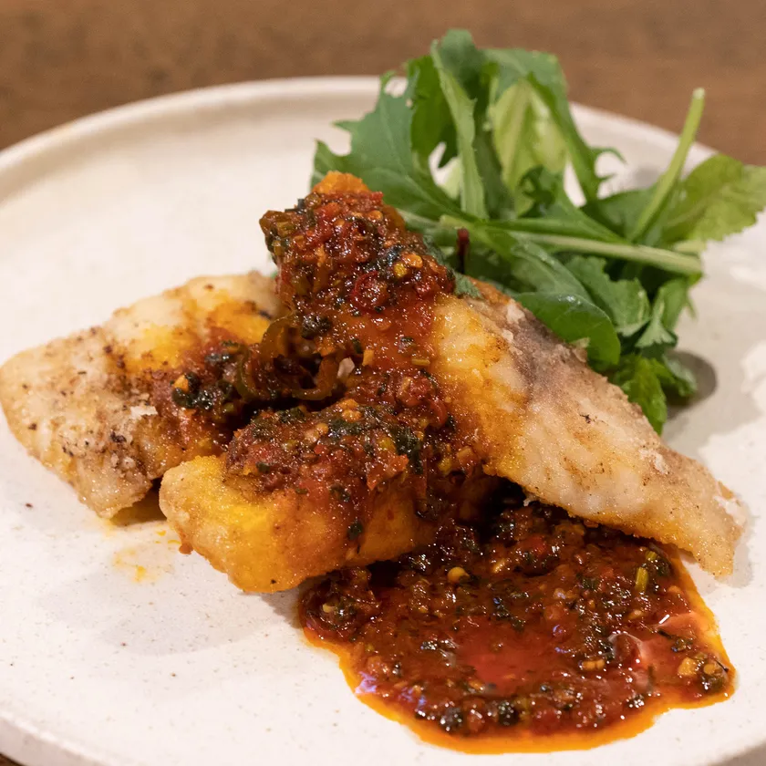 そのまま食べても美味しい新鮮な魚のフライに、オリジナルの麻辣ハーブソースをかけて。とにかく麻辣ソースにハマる!