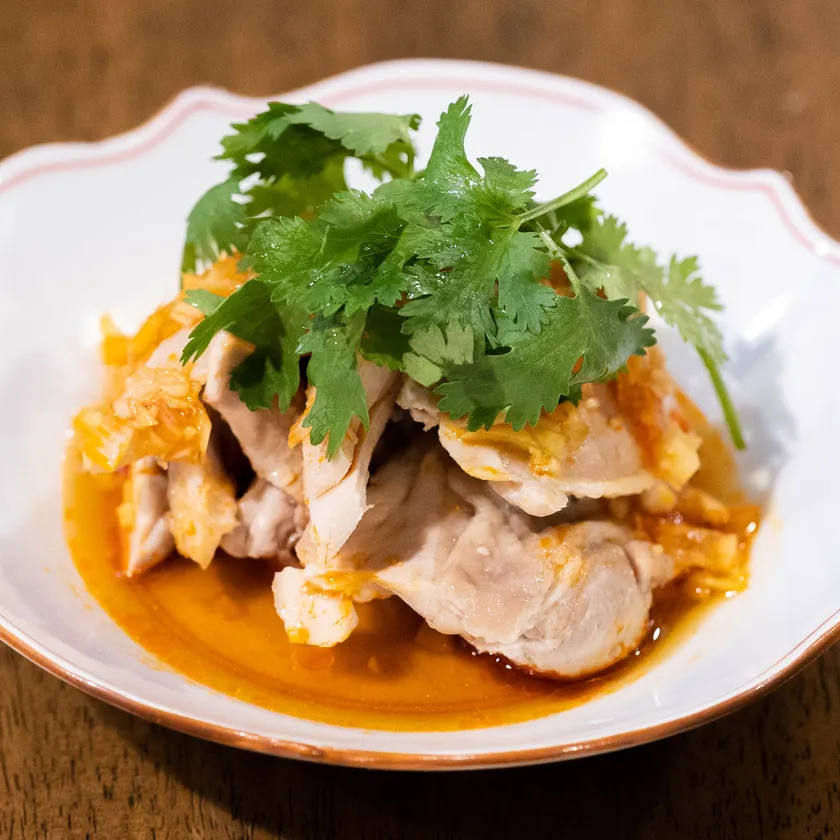 自家製のタレで食べるよだれ鶏。名前の通りしっかり辛い!