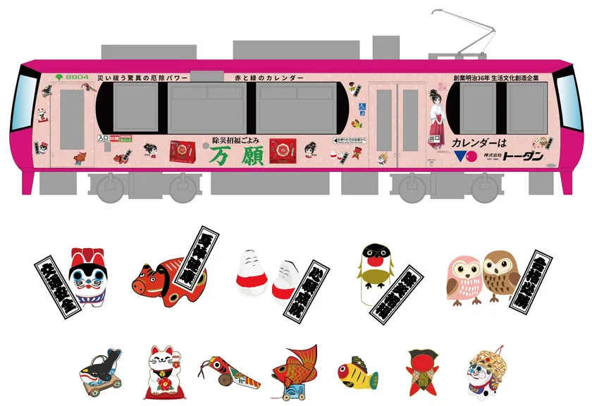 (車両デザインに使用されている縁起物の詳細→ https://www.todan.co.jp/tram2023/ )