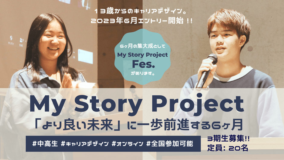 「自分のやりたいことがわからない」「やりたいことは漠然とあるけど、何から始めたらいいのかわからない」、そんな悩みを持った中高生に届けたい、自分だけのキャリアデザインを描くMy Story Projct(以下、MSP)。マンツーマンで7月下旬頃から約半年間かけて、あなたの「感じたこと、考えたこと」から始まる自己探究/社会探究を進めていきます。