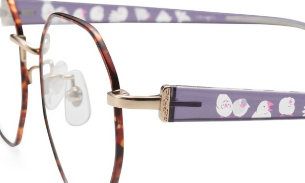個性がきいたオクタゴン(八角形)のレンズシェイプ。つるのメタルパーツにはインコの足跡付き。つるはクリア印刷で、裏表両方から鳥たちを見ることができます。