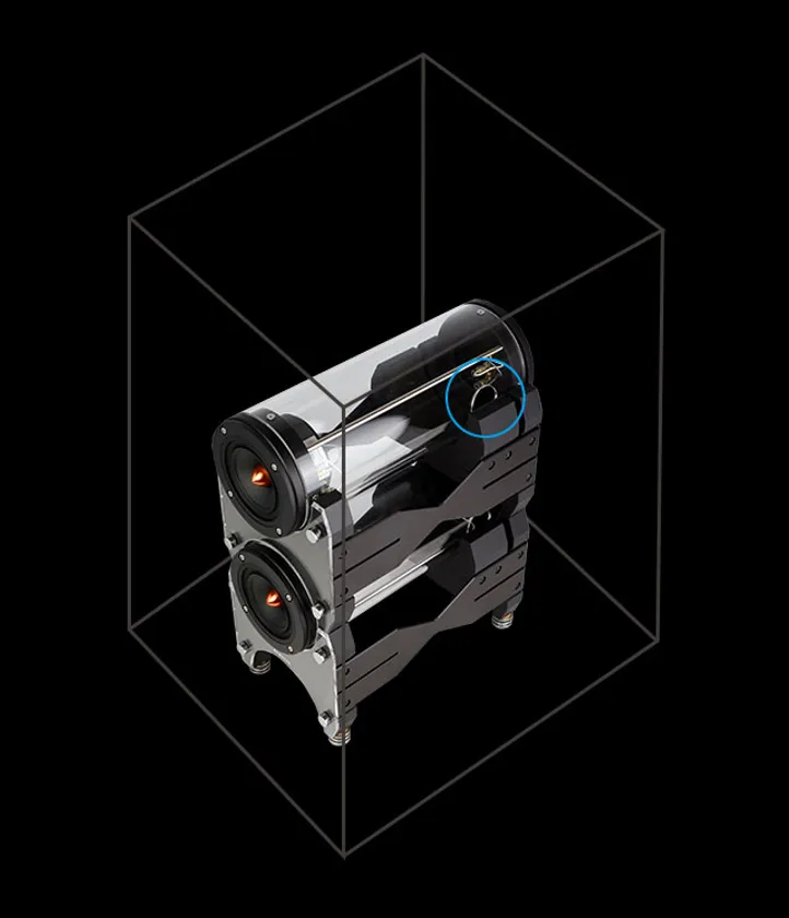 BOWDOCK SOLIDの上部キャビネットはBOWDOCKと共通のものを縦に配列。スピーカーユニット背面からの音を最大限に利用するためにスピーカーを取り付けるマウンターの一番薄い部分は約1mm。サイドパネルにもアルミパーツを採用して強度と高級感を生み出しています。