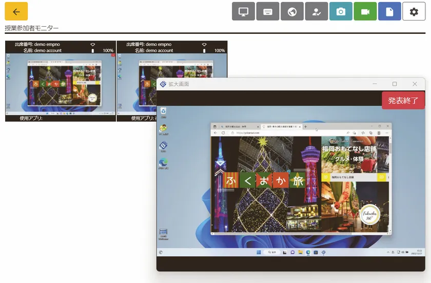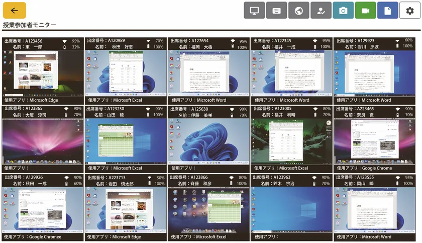 授業中の学生全員の画面を同時に確認する機能。個別画面の拡大も可能です。