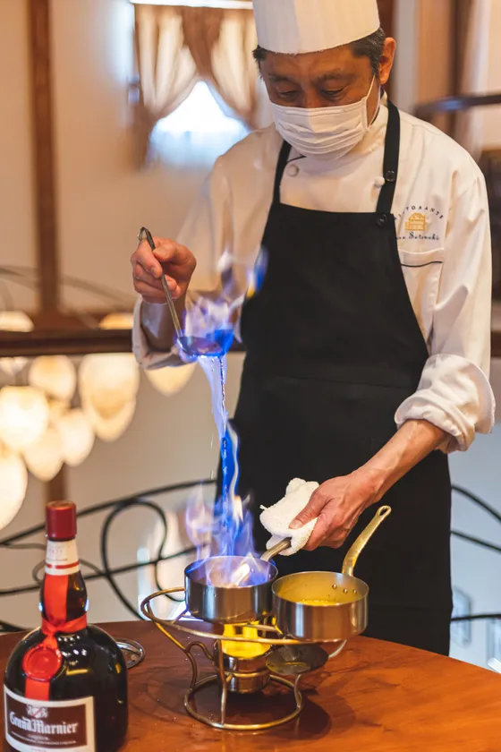 勢いよく上がる炎と共に、グラン・マニエ(オレンジリキュール)の良い香りが広がります。
