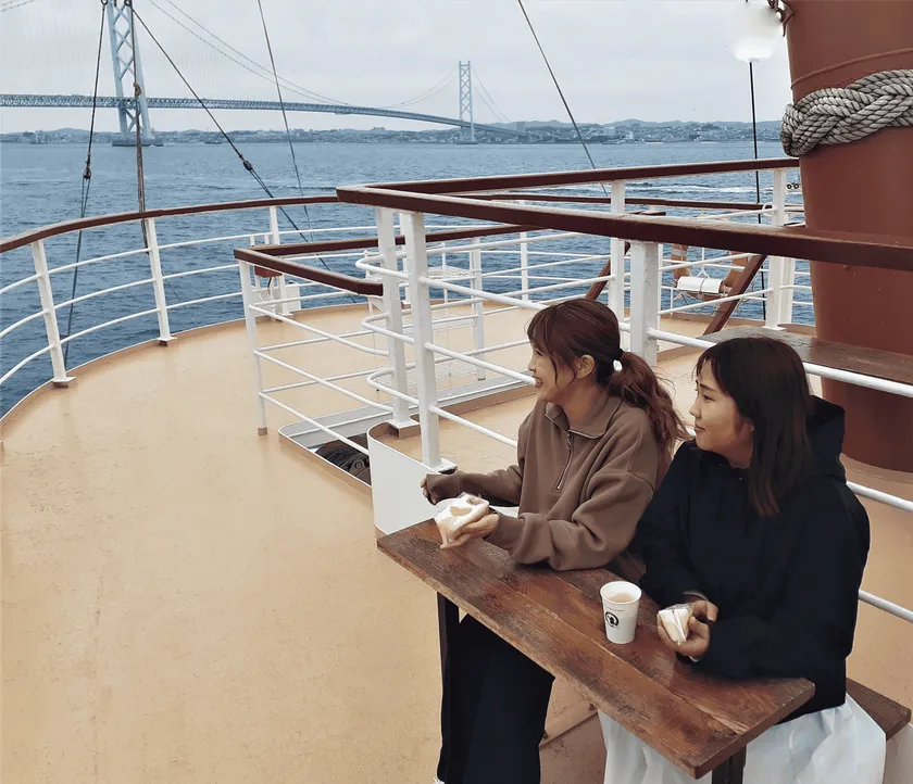 クルージングをより快適に過ごしていただくために出来る限り船内の立席を減らし、イスとテーブル席をご用意しました。軽食やドリンク、淡路島のスイーツを片手に「贅沢な船旅」、時間の流れを気にせず優雅なひと時をお過ごしいただける唯一無二の体験をお楽しみいただけます。