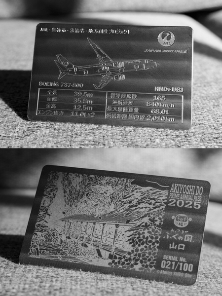 そして今回、JALエンジニアリングの協力のもと、三者連携によるものづくり企画として、JAL整備士と美祢市内事業者「株式会社M.I.W」の職人によって製作されたオリジナルチタンカードが製作され、現在好評販売中です。