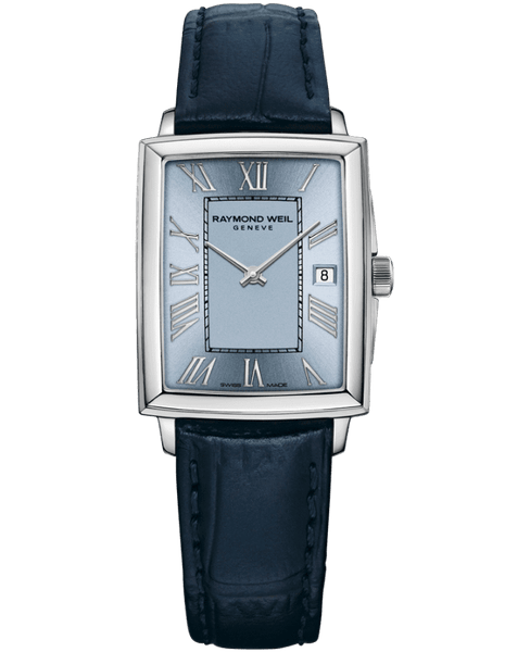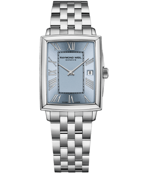 文字盤に使用している爽やかで清潔感のある印象を与えるライトブルーは、夏のコーディネートに是非とも取り入れたいカラーです。インデックスはローマ数字を用いた立体感のあるアプライド仕様で、3 時位置に日常使いに便利な日付表示を備えています。文字盤の中央には、「アール・デコ」の特徴のひとつである幾何学模様が長方形を象っています。長方形の内側は、ラッカー仕上げによりマットな質感を表現し、上部にレイモンド・ウェイルのブランドロゴを刻印しています。一方、長方形の外側は、サテン仕上げ・サンレイ仕上げを施しており、角度によって変わる独特の光沢が高級感を演出します。