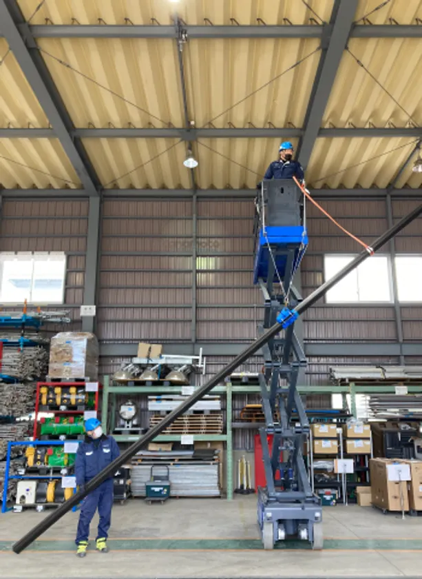 固縛装置に固縛した角パイプは、高所作業車を上昇させることで建て起こされる仕組みとなっているため、従来に比べ、角パイプの脱落・落下リスクと作業員の肉体的負担を大きく低減することが可能です。また、高所作業車に搭乗している作業員1名と床面の作業員1人で作業が可能なため、作業員を1~2名削減することができます(写真2)。