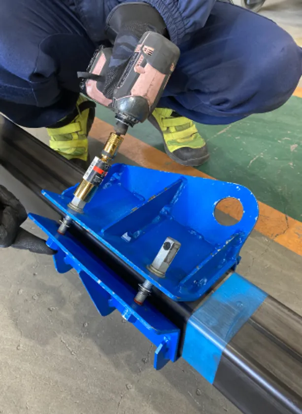 ・「固縛装置」は、角パイプの周囲(4面)を鉄製の枠で囲み、締付け部のボルトをインパクトレンチで締め付けることで固縛します(写真4)。なお、枠の内側にはゴムを貼付し、角パイプの脱落を防止しています。