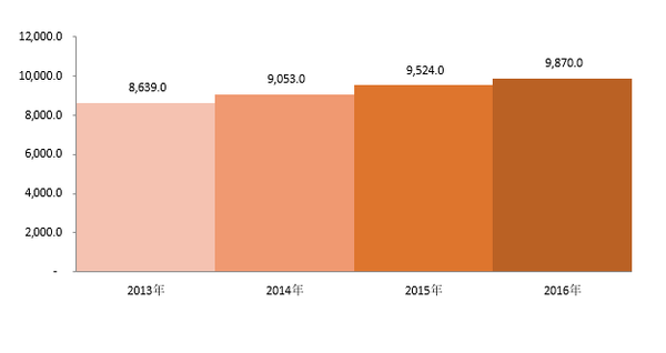 一人当たりの米国医療費、(USD)、2013ー2016年