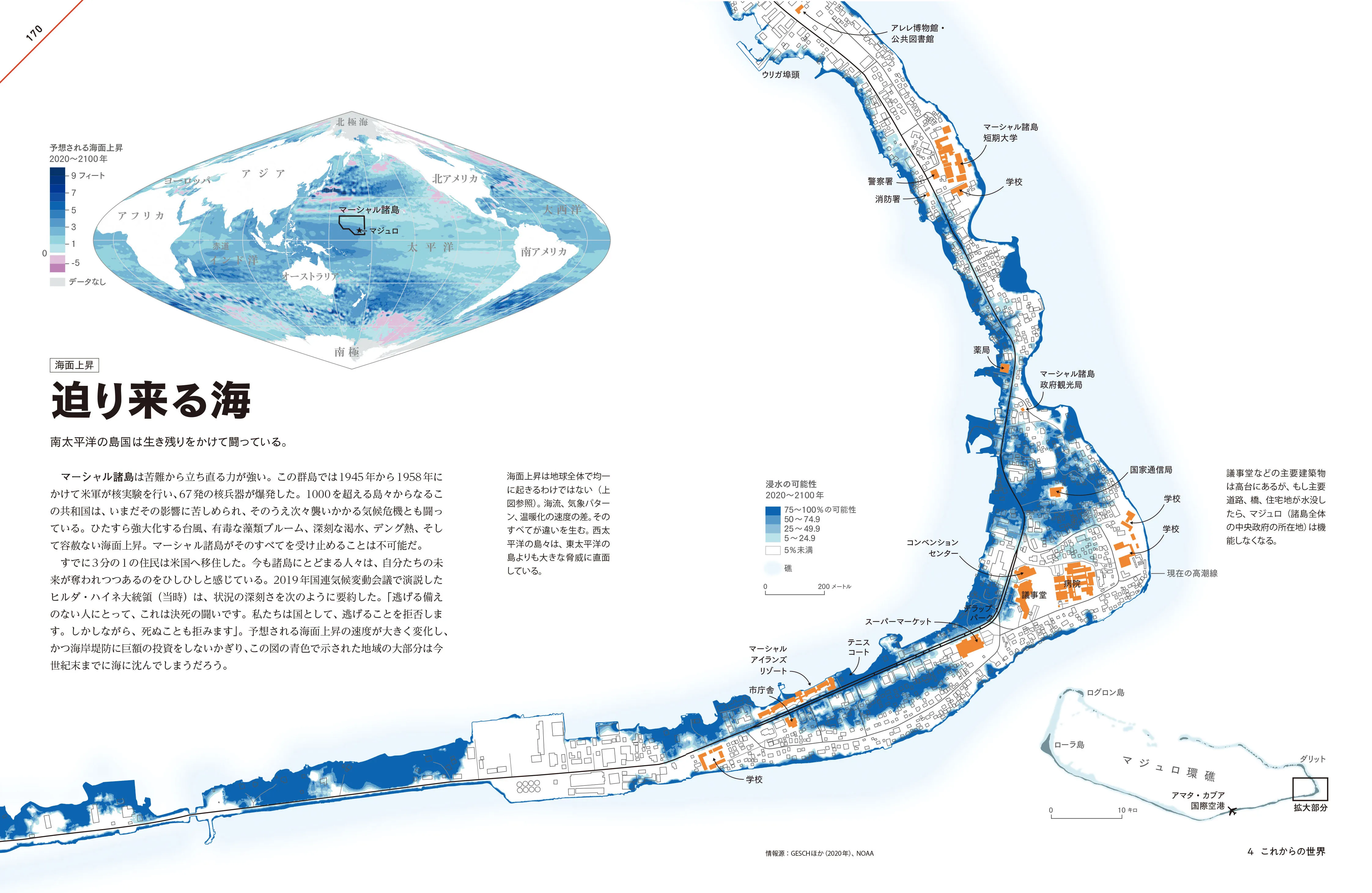 1章「人類の歴史」では、捕鯨船の経路や奴隷貿易など人類の所業や移動経路など、過去にさかのぼってみていきます。2章「人間の活動」では、人口動態や被災地からの避難、携帯電話の基地局など地球の現在に迫ります。3章「今の地球」では、国ごとの幸福度、汚染物質の出所、ジェンダーギャップなど各地域における現代の生活状態を比較します。4章「これからの世界」では、気温の変化、海面上昇、人口構成など、現在直面している将来に向けての問題点をビジュアル化しています。「この100年、地球はどれくらい暑くなった?」「男女の家事負担、各国はどれくらい?」「世界でいちばん不便な場所はどこ?」など、あらゆるデータを地図というビジュアルで可視化し、読み解きます。