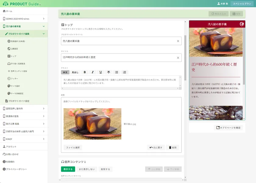 株式会社トゥーエイト(東京都渋谷区、代表取締役:木野 敦)は、2023年5月8日(月)より日本の名産品やこだわりの伝統工芸品、日本酒・陶磁器・和菓子といったジャパンメイドの製品ストーリーや歴史・伝統を声で伝える、ものづくりのためのスマホ音声ガイドサービス『プロダクトガイド』を本格スタートいたしました。月額500円(税別)で気軽に導入が可能、基本機能を無料でお試しいただけるフリープランもご用意しています。