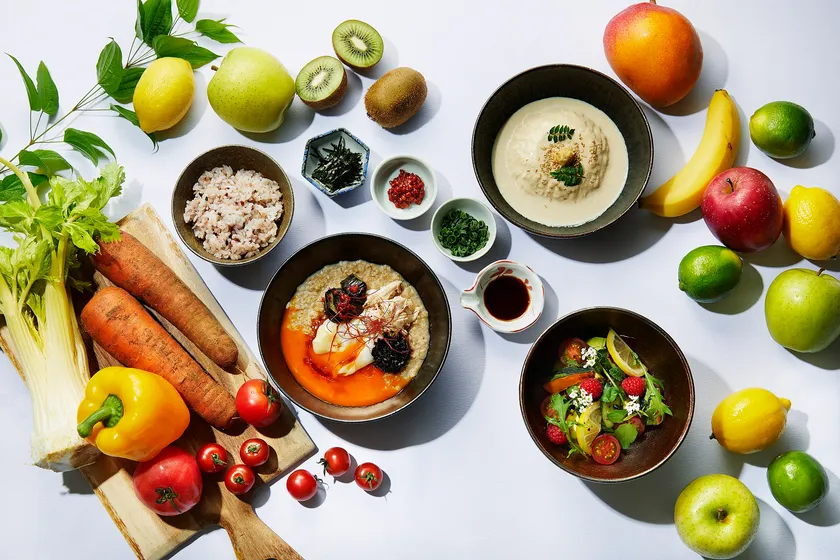 キヌアボウルはスーパーフードのキヌアに10種類以上の野菜、フレッシュチーズの爽やかさと濃厚なクリームを併せ持つ東京ブラータチーズを合わせました。はちみつとマスタードのドレッシングをかけ、よく混ぜて食べるのがおすすめです。ざる湯豆腐御膳はたんぱく質やカルシウム、ビタミンを多く含む大豆をメインした内容です。和だしとごまの香りを利かせた豆乳のスープで温めたざる豆腐を十穀米とともに。和風チキンオートミールは通常、ミルクなどで調理するオートミールを和だしと味噌で味付けしました。温泉卵と鶏むね肉にお好みの付け合わせでお楽しみいただけます。