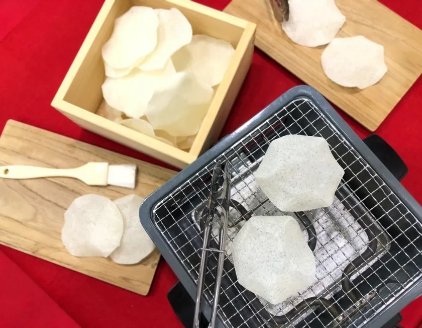 せんべいを焼いている瞬間は、まるで手遊び歌の「おせんべ焼けたかな」を想起させるようなひとときです。