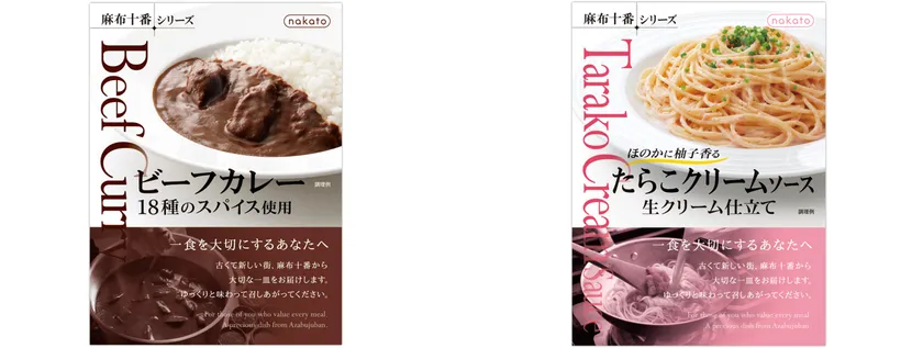 nakato「麻布十番シリーズ」の 『ビーフカレー 18種のスパイス使用』と 『たらこクリームソース 生クリーム仕立て』の 2品をリニューアル発売