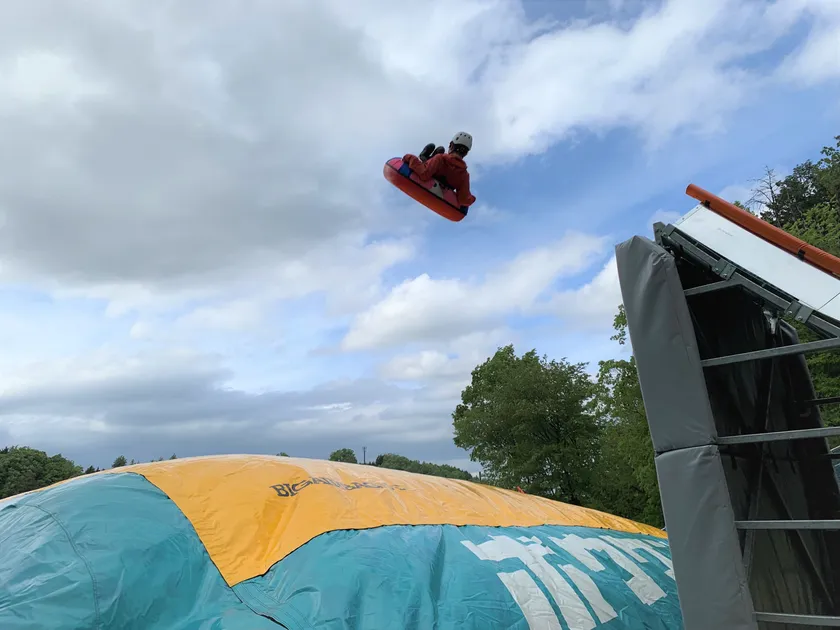 オランダ発祥の遊具で、海外ではTubby Jumpとして親しまれています。今回は、大阪と名古屋をつなぐ主要幹線道路「名阪国道」に隣接した山林に12mと7.7mのジャンプ台を設置、そこから特設レーンを滑ってジャンプする体験が楽しめます。