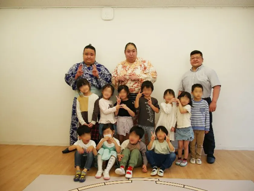 訪問時は、2分の1サイズの土俵を用意し、元気いっぱいの園児たちとの相撲、腕相撲勝負、質問コーナーなどで盛り上がり、最後に記念撮影をしてたくさん触れ合いました。