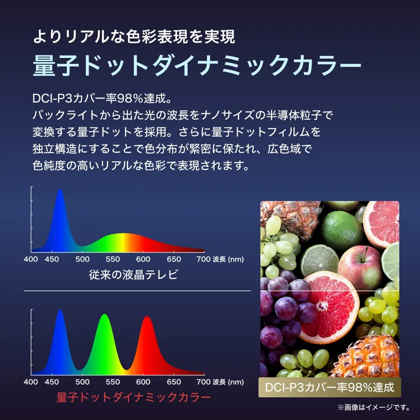 バックライトから出た光の波長をナノサイズの半導体粒子で変換する量子ドットを採用。さらに量子ドットフィルムを独立構造にすることで色分布が緊密に保たれ、広色域で色純度の高いリアルな色彩で表現します。(DCI-P3カバー率98%達成)