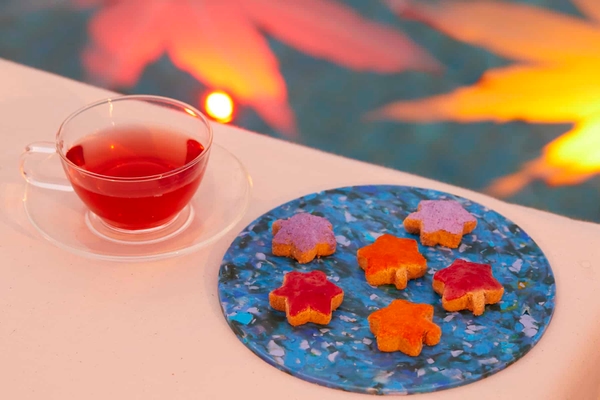 ビーチに建つBOOKS&CAFEでは、数量限定で「紅葉ちんすこう」を提供します。紅葉の形をしたちんすこうに沖縄らしい紅いもなどのジャムで色付けをし、紅葉を表現しました。青いプレートで提供するので、秋色に染まるプールの光景を手元でも楽しめます。また、飲み物はこの時期に咲くローゼルを使用した紅茶です。